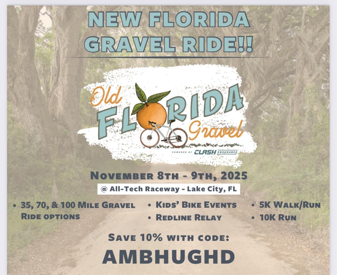 « All Events Old Florida Gravel November 8 @ 8:00 am - November 9 @ 5:00 pm « Monster Mash CCS Fall 25 AL/FL Series Finals » Add to calendar Google Calendar iCalendar Outlook 365 Outlook Live Details Start: November 8 @ 8:00 am End: November 9 @ 5:00 pm Event Category: Race Event Tags:Bike Race, Columbia County Sports Commission, gravel road, Old Florida Gravel Website: https://www.playeasy.com/events/11f636c4-b1b6-4fa3-8192-44170d1a75bb Organizer Clash Endurance View Organizer Website Venue All Tech Raceway 1024 SW Howell Rd. Lake City, Florida 32024 + Google Map View Venue Website
